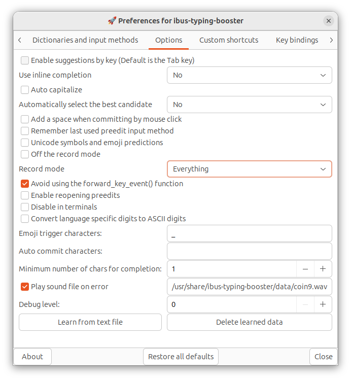 এরপরে “Options” ট্যাবে গিয়ে সেখান থেকে Use inline completion, Auto Capitalize, Unicode Symbols & Emoji Prediction, Add a space when committing by mouse click, Off the record mode ইত্যাদি করে দিতে পারেন। Record Mode এর জন্য everything সিলেক্ট করতে হবে। Word Predictions অবশ্যই চালু থাকতে হবে। (নিচের ছবির মতো দেখাতে হবে)