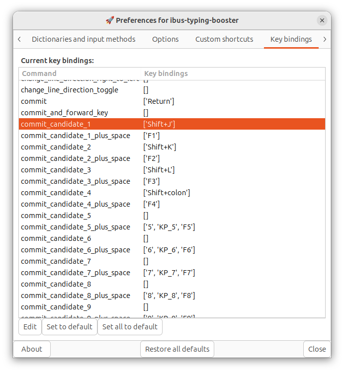 এরপরে “Keybindings” ট্যাবে যেতে হবে। সেখানে Commit এর জন্য Enter, Commit-candidate-1 এর জন্য কিবোর্ডের Shift+J সেট করুন। commit-candidate-1-plus-space এখান থেকে 1-কে, এবং KP_1-কেও সরিয়ে দিতে হবে। এটা করার কারণ হলো বাংলার জন্য সাজেশন কমিট করার পর স্পেস যুক্ত হওয়াটা ভালো না। বাংলায় বিভক্তি, কিংবা দুই শব্দ জোড়া দিয়ে লিখতে হতে পারে। যাই হোক এভাবে 1 থেকে 4 পর্যন্ত J,K,L, এবং সেমিকোলন (;) সেট করবেন। 4 এর বেশি করতে যাবেন না। এডিট করা হলে নিচের ছবির মতো দাঁড়াবে: