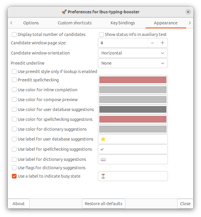 এরপরে আমাদের কাজ “Appearance” ট্যাবে। এখানেও যতোগুলো চেকবক্স আছে সবগুলো বন্ধ করে দিতে হবে (যাতে টাইপিং বুস্টার দ্রুত কাজ করবে)। এরপরে Candidate window page size করতে পারেন সর্বোচ্চ 4; কারণ চারটির বেশি সাজেশন আসলে সেটা লেখার প্রতি মনোযোগ নষ্ট করতে পারে। এরপরে Candidate window orientation করে দিতে হবে Horizontal এতে চোখ কম নাড়িয়ে সবগুলো সাজেশন দেখতে পাওয়া যাবে। Preedit underline “Single” রাখতে পারেন; তবে এটা একটা রাখলেই হলো।
